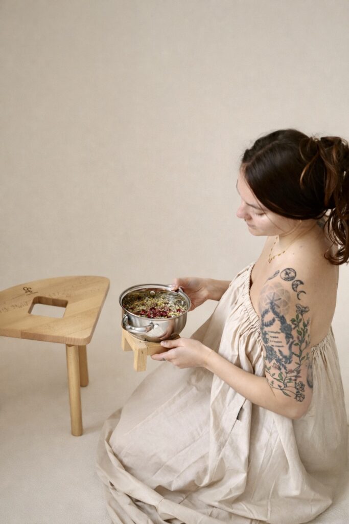 Women’s herbal steaming works similarly to classic sinus steaming, but it focuses on the pelvic floor area. It is a common hygiene practice for women around the world, which can also be seen as a sacred, healing ritual of connecting with your womb and femininity. It supports and revitalizes the reproductive organs and brings many other benefits! More about the benefits